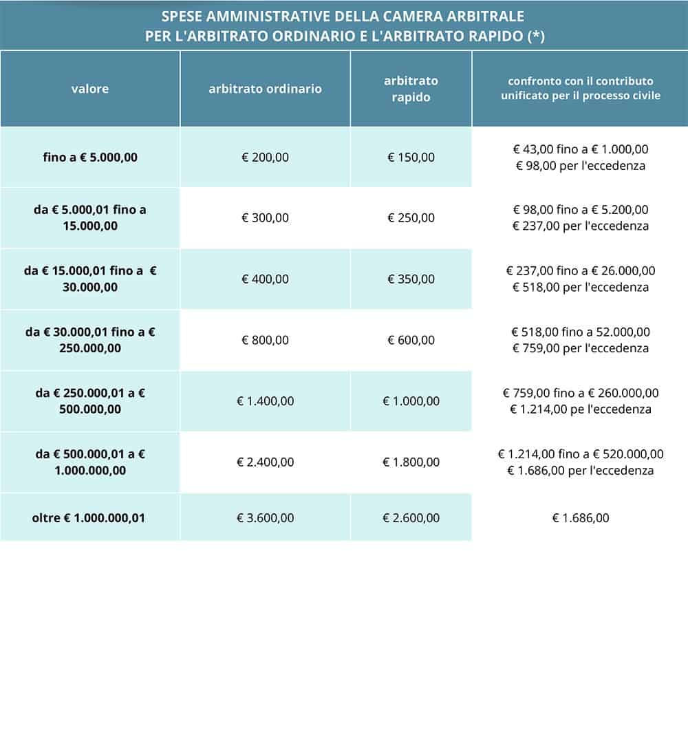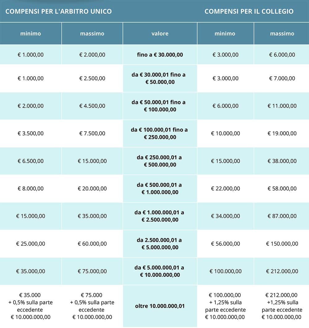 Le tariffe per l’arbitrato (sia le spese amministrative che gli onorari arbitrali) sono competitive e volte all’applicazione del principio dell’equo compenso e sono al netto di IVA. Le spese amministrative devono essere corrisposte da ciascuna delle parti all’atto del deposito dell’istanza di arbitrato o di nomina dell’arbitro.