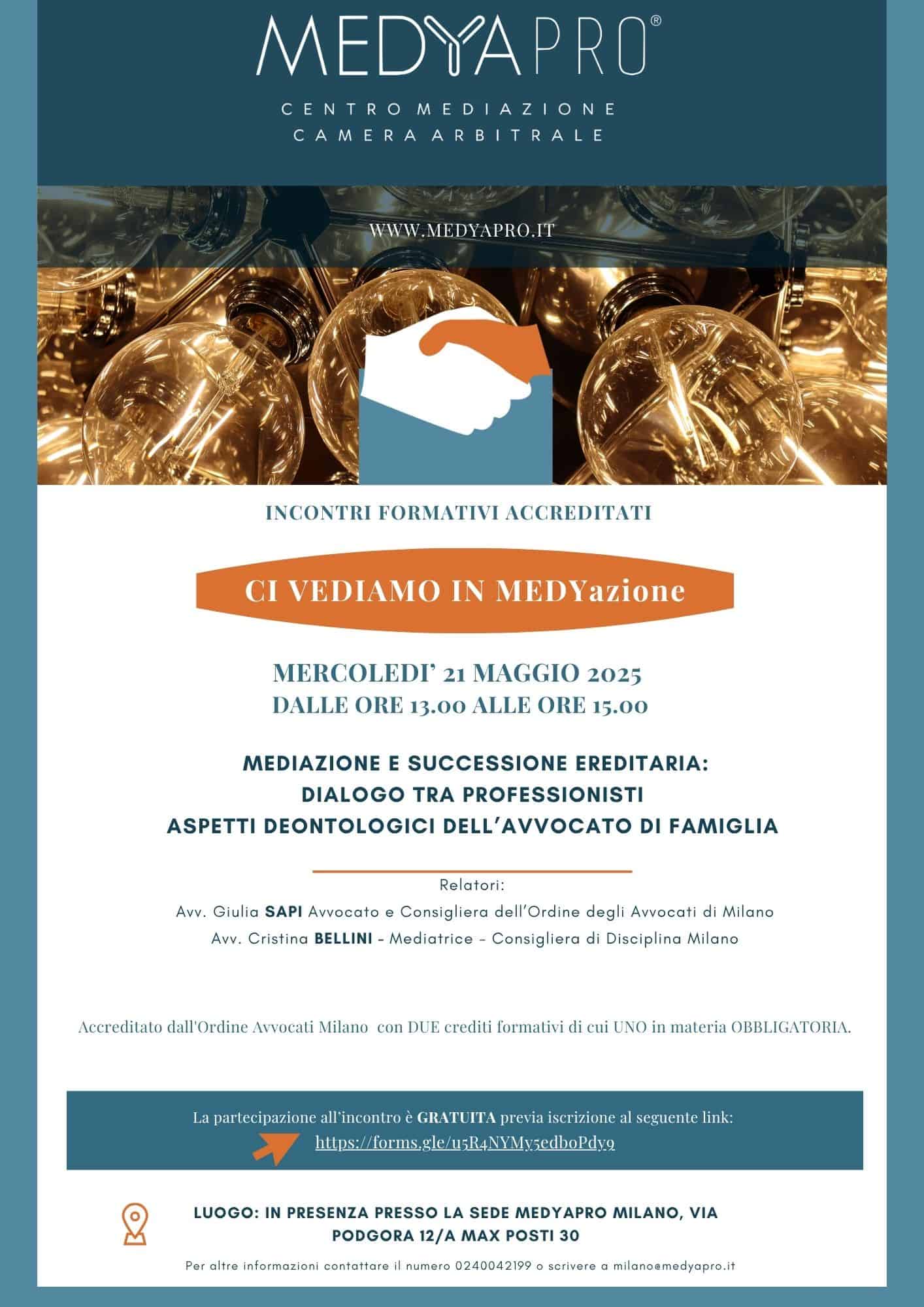MedyaPro è lieta di annunciare un evento formativo accreditato per avvocati dedicato agli strumenti di risoluzione dei conflitti per avvocati, con un focus particolare su Mediazione e Successione ereditaria. L'incontro […]