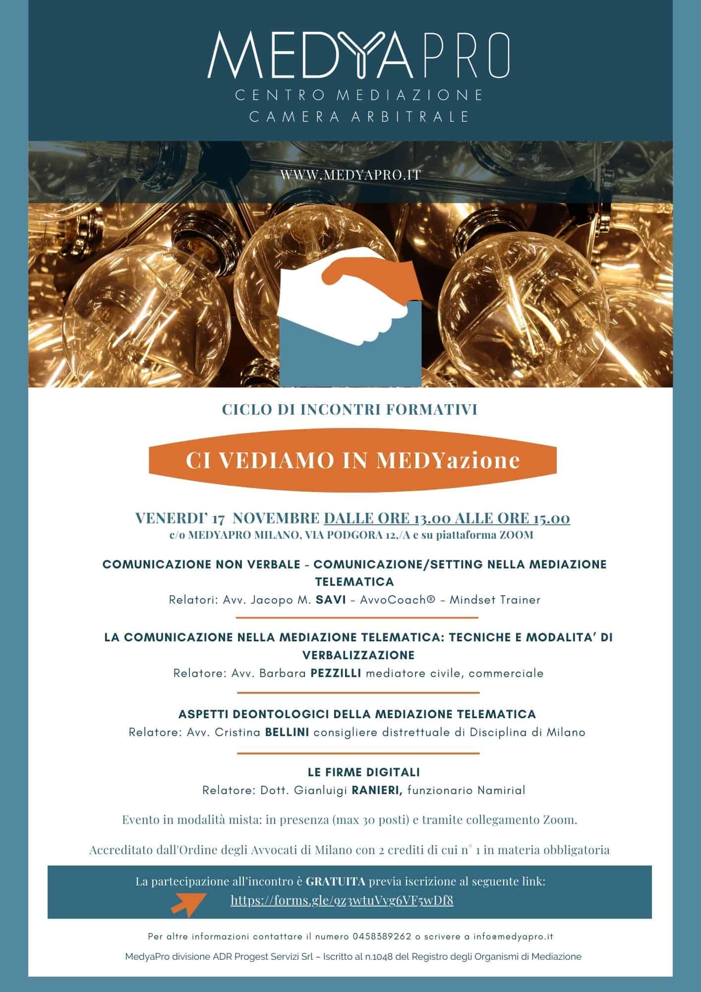 Ciclo di incontri accreditati online sulla mediazione, la comunicazione non verbale, la comunicazione nella mediazione telematica, gli aspetti deontologici e le firme digitali.