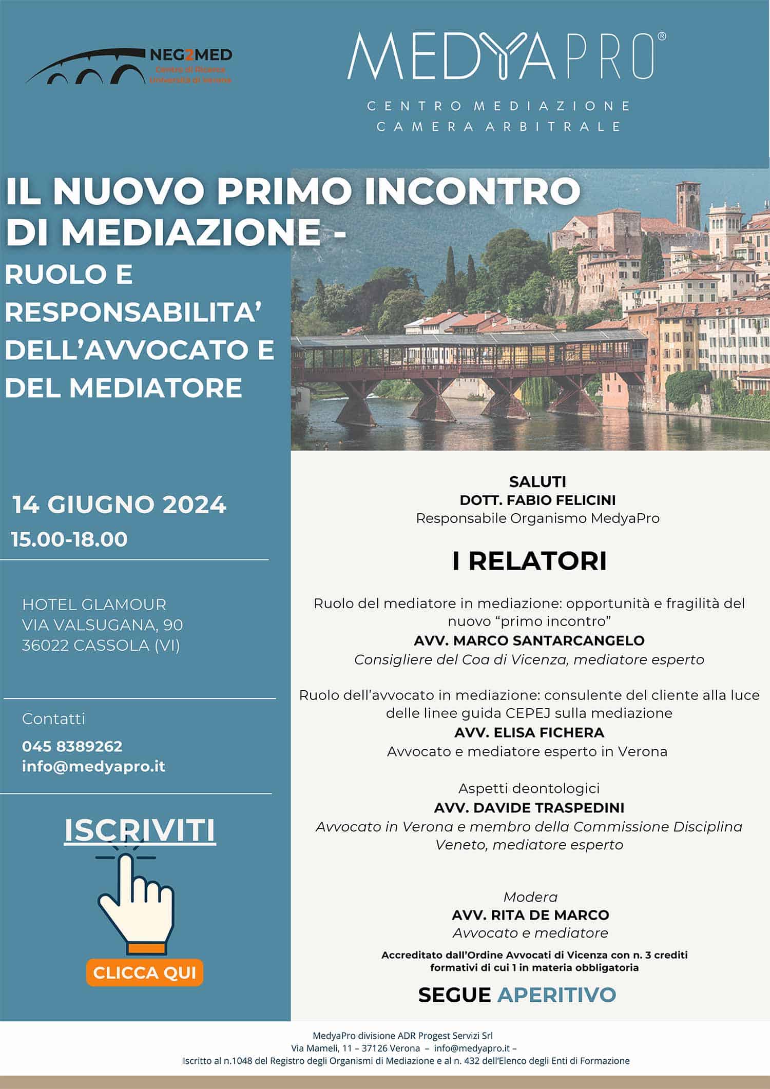 MedyaPro è lieta di annunciare un convegno dedicato al ruolo e alle responsabilità dell’avvocato e del mediatore nel contesto del nuovo primo incontro di mediazione. L’evento si terrà il 14 giugno 2024, dalle ore 15:00 alle 18:00, presso l’Hotel Glamour, Via Valsugana, 90, 36022 Cassola (VI).