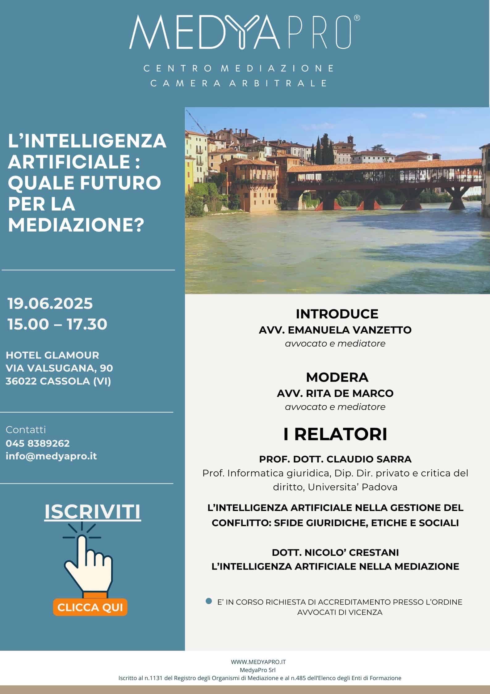 Intelligenza artificiale: quale futuro per la mediazione? Questa il tema del convegno organizzato dalla sede MedyaPro di Bassano del Grappa (Vicenza) il 19 giugno 2025, dalle ore 15.00 alle ore 17.30.